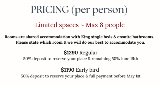 Meals will all be cooked in-house. If you have special dietary requirements, please let us know prior to your stay. Water, juice, tea and coffee are freely available.
